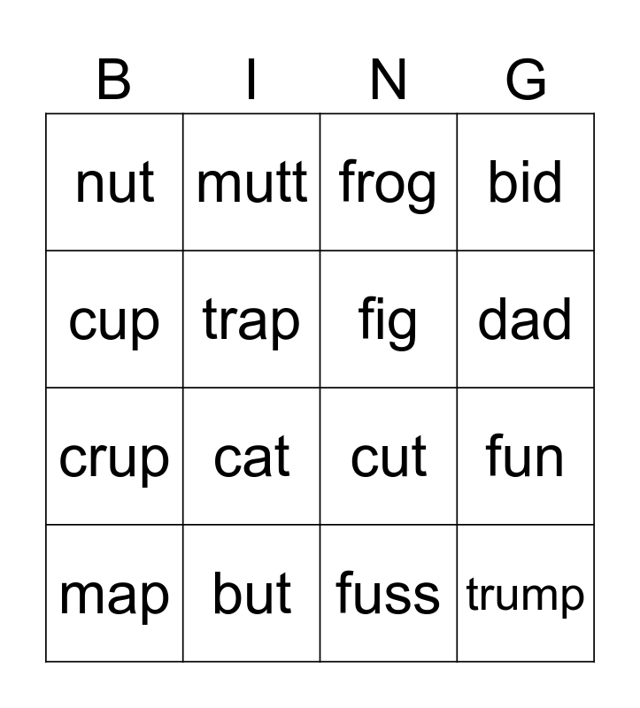 This bingo card has 20 words: fun, fog, frog, dog, map, cup, but, nut, crup, mutt, cat, cut, trap, trump, fig, bob, dad, bid, fuss and hut.