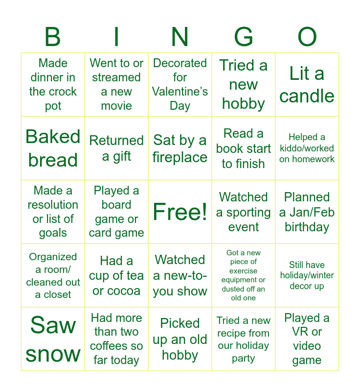 This bingo card has a free space and 24 words: Had a cup of tea or cocoa, Had more than two coffees so far today, Sat by a fireplace, Saw snow, Lit a candle, Made dinner in the crock pot, Baked bread, Went to or streamed a new movie, Watched a sporting event, Watched a new-to-you show, Read a book start to finish, Made a resolution or list of goals, Got a new piece of exercise equipment or dusted off an old one, Still have holiday/winter decor up, Returned a gift, Tried a new recipe from our holiday party, Planned a Jan/Feb birthday, Decorated for Valentine’s Day, Helped a kiddo/worked on homework, Played a board game or card game, Played a VR or video game, Organized a room/ cleaned out a closet, Tried a new hobby and Picked up an old hobby.