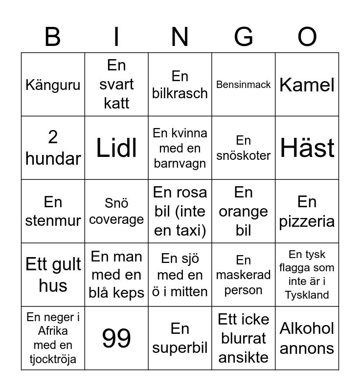 This bingo card has a free space and 24 words: En man med en blå keps, 99, En kvinna med en barnvagn, En neger i Afrika med en tjocktröja, Kamel, Känguru, 2 hundar, En svart katt, En orange bil, En sjö med en ö i mitten, En snöskoter, En stenmur, En maskerad person, En tysk flagga som inte är i Tyskland, Lidl, Ett icke blurrat ansikte, En pizzeria, En bilkrasch, Häst, Snö coverage, Alkohol annons, Ett gult hus, Bensinmack and En superbil.