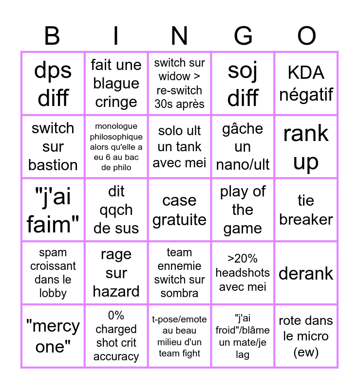 This bingo card has a free space and 24 words: rage sur hazard, 0% charged shot crit accuracy, solo ult un tank avec mei, "mercy one", KDA négatif, dps diff, switch sur bastion, fait une blague cringe, play of the game, team ennemie switch sur sombra, gâche un nano/ult, "j'ai faim", >20% headshots avec mei, derank, monologue philosophique alors qu'elle a eu 6 au bac de philo, "j'ai froid"/blâme un mate/je lag, tie breaker, switch sur widow > re-switch 30s après, rank up, dit qqch de sus, rote dans le micro (ew), spam croissant dans le lobby, soj diff and t-pose/emote au beau milieu d'un team fight.