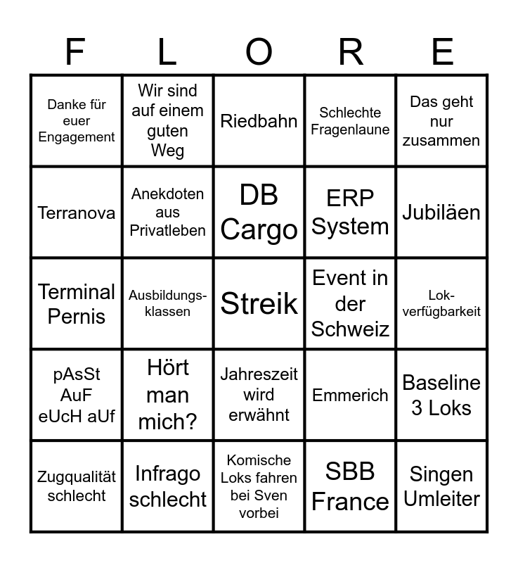 This bingo card has a free space and 24 words: Hört man mich?, Infrago schlecht, DB Cargo, Zugqualität schlecht, Das geht nur zusammen, Danke für euer Engagement, Terranova, Wir sind auf einem guten Weg, Event in der Schweiz, Jahreszeit wird erwähnt, ERP System, Terminal Pernis, Emmerich, Baseline 3 Loks, Anekdoten aus Privatleben, SBB France, Lok-verfügbarkeit, Riedbahn, Jubiläen, Ausbildungs-klassen, Singen Umleiter, pAsSt AuF eUcH aUf, Schlechte Fragenlaune and Komische Loks fahren bei Sven vorbei.