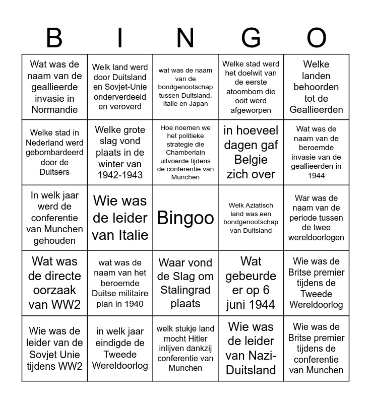This bingo card has a free space and 24 words: wat was de naam van het beroemde Duitse militaire plan in 1940, in welk jaar eindigde de Tweede Wereldoorlog, Hoe noemen we het politieke strategie die Chamberlain uitvoerde tijdens de conferentie van Munchen, Wie was de leider van de Sovjet Unie tijdens WW2, Welke landen behoorden tot de Geallieerden, Wat was de naam van de geallieerde invasie in Normandie, Welke stad in Nederland werd gebombardeerd door de Duitsers, Welk land werd door Duitsland en Sovjet-Unie onderverdeeld en veroverd, Welk Aziatisch land was een bondgenootschap van Duitsland, Waar vond de Slag om Stalingrad plaats, in hoeveel dagen gaf Belgie zich over, In welk jaar werd de conferentie van Munchen gehouden, Wat gebeurde er op 6 juni 1944, Wie was de Britse premier tijdens de Tweede Wereldoorlog, Welke grote slag vond plaats in de winter van 1942-1943, Wie was de leider van Nazi-Duitsland, War was de naam van de periode tussen de twee wereldoorlogen, wat was de naam van de bondgenootschap tussen Duitsland, Italie en Japan, Wat was de naam van de beroemde invasie van de geallieerden in 1944, Wie was de leider van Italie, Wie was de Britse premier tijdens de conferentie van Munchen, Wat was de directe oorzaak van WW2, Welke stad werd het doelwit van de eerste atoombom die ooit werd afgeworpen and welk stukje land mocht Hitler inlijven dankzij conferentie van Munchen.