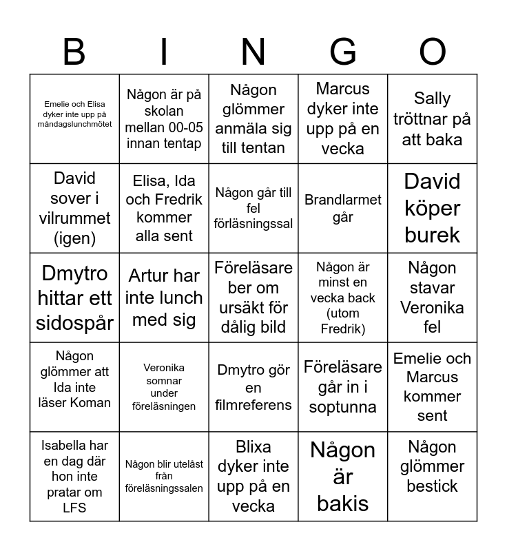 This bingo card has a free space and 24 words: Veronika somnar under föreläsningen, Någon blir utelåst från föreläsningssalen, Någon går till fel förläsningssal, Isabella har en dag där hon inte pratar om LFS, Sally tröttnar på att baka, Emelie och Elisa dyker inte upp på måndagslunchmötet, David sover i vilrummet (igen), Någon är på skolan mellan 00-05 innan tentap, Någon är minst en vecka back (utom Fredrik), Dmytro gör en filmreferens, Brandlarmet går, Dmytro hittar ett sidospår, Föreläsare går in i soptunna, Emelie och Marcus kommer sent, Elisa, Ida och Fredrik kommer alla sent, Någon är bakis, Någon stavar Veronika fel, Någon glömmer anmäla sig till tentan, David köper burek, Artur har inte lunch med sig, Någon glömmer bestick, Någon glömmer att Ida inte läser Koman, Marcus dyker inte upp på en vecka and Blixa dyker inte upp på en vecka.