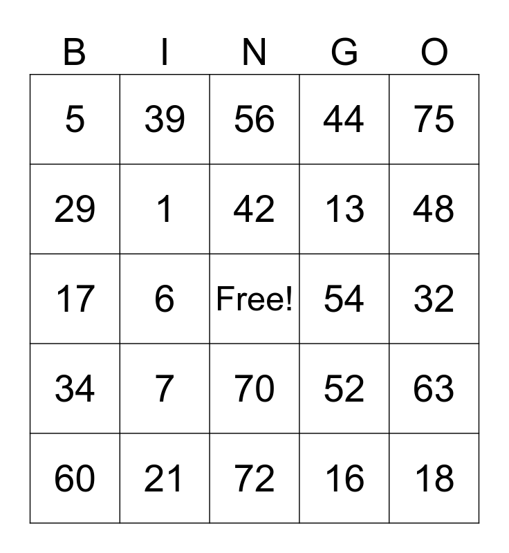 This bingo card has a free space and 24 words: 7, 21, 42, 60, 75, 5, 29, 39, 54, 70, 13, 17, 52, 63, 1, 16, 32, 56, 48, 6, 18, 34, 44 and 72.