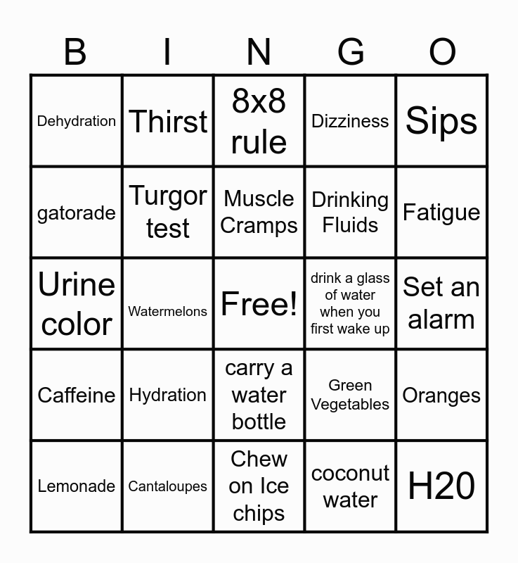 This bingo card has a free space and 24 words: Hydration, Cantaloupes, Muscle Cramps, Lemonade, Sips, Dehydration, gatorade, Thirst, drink a glass of water when you first wake up, carry a water bottle, Drinking Fluids, Urine color, Green Vegetables, Oranges, Turgor test, coconut water, Set an alarm, 8x8 rule, Fatigue, Watermelons, H20, Caffeine, Dizziness and Chew on Ice chips.