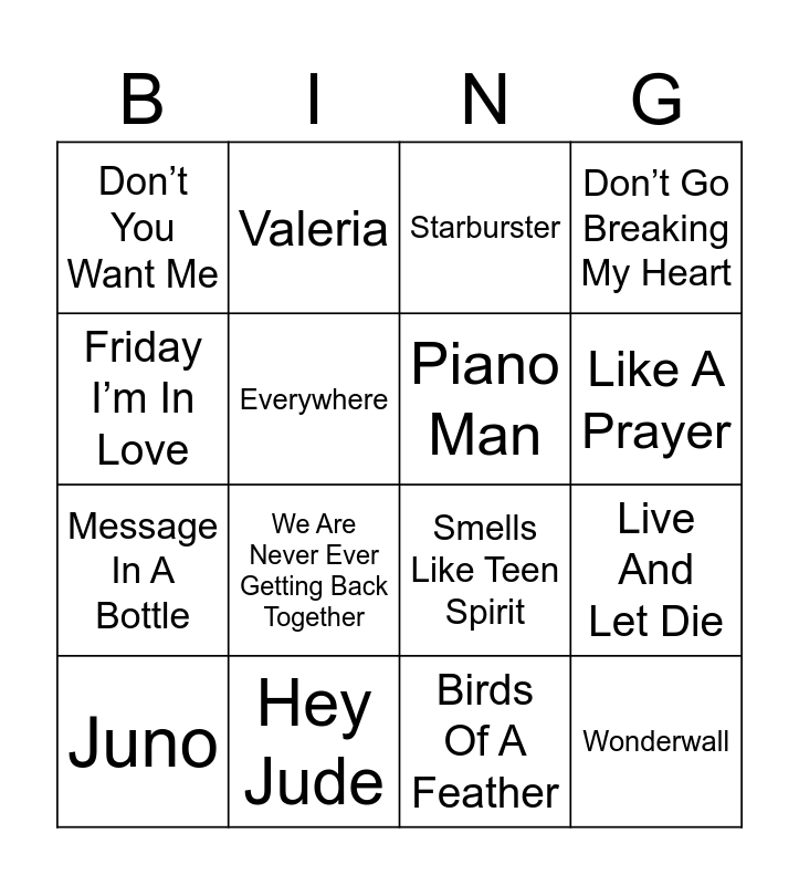 This bingo card has 46 words: Son Of A Preacher Man, Juno, Pink Pony Club, Messy, You’re So Vein, Ain’t No Mountain High Enough, Valeria, Linger, Everywhere, Come On Eileen, Piano Man, Don’t Go Breaking My Heart, Go Your Own Way, Heart Of Glass, Heroes, Every Breath You Take, Like A Prayer, Hey Jude, Dancing Queen, Friday I’m In Love, Live And Let Die, Faith, Don’t You Want Me, Message In A Bottle, Let’s Dance, We Are Never Ever Getting Back Together, 24k Magic, Die With A Smile, Mr. Brightside, Wonderwall, Superstition, Sir Duke, 365, Feels, I Kissed A Girl, Beat It, Birds Of A Feather, We Can’t Be Friends, I’m A Believer, Walking On Sunshine, Walking On Sunshine, Starburster, Smells Like Teen Spirit, Seven Nation Army, Can’t Stop and Song 2.