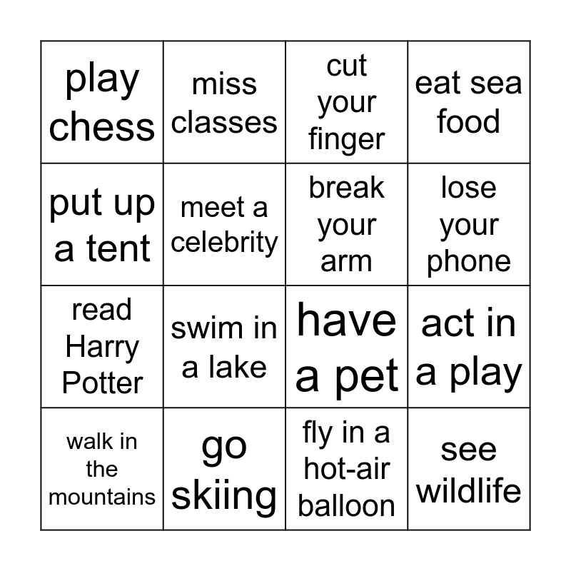 This bingo card has 22 words: go skiing, be in hospital, miss classes, have an unlucky day, meet a celebrity, break your arm, play chess, cut your finger, have a pet, see wildlife, read Harry Potter, eat sea food, speak to a foreigner, write a story, fly in a hot-air balloon, be to a different country, act in a play, walk in the mountains, swim in a lake, put up a tent, lose your phone and see the stars.