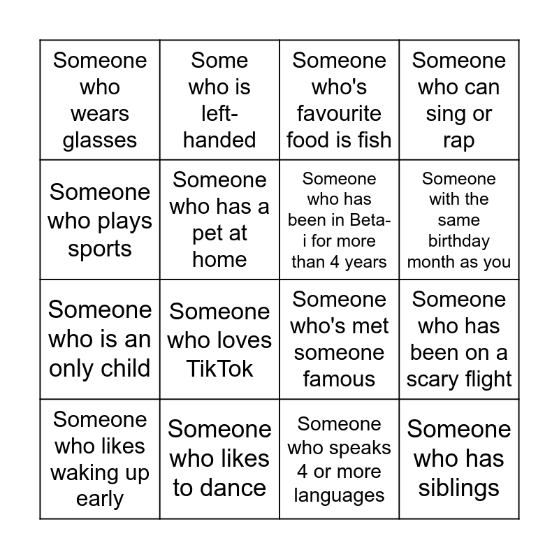 This bingo card has 23 words: Someone who has siblings, Someone who has won an Oscar, Someone with the same birthday month as you, Someone who has broken a bone, Someone who plays sports, Someone who wears glasses, Someone who has a pet at home, Some who is left-handed, Someone who likes waking up early, Someone with the same number of names as you, Someone who loves TikTok, Someone who is an only child, Someone who is afraid of spiders, Someone who likes to go to the movies alone, Someone who likes to dance, Someone who has lived abroad, Someone who's favourite food is fish, Someone who's met someone famous, Someone who has been in Beta-i for more than 4 years, Someone who has been on a scary flight, Someone who can sing or rap, Someone who speaks 4 or more languages and Someone who does volunteer work.