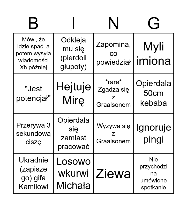 This bingo card has 19 words: Wyzywa się z Graalsonem, Zmienia zdanie, Zapomina, co powiedział, Nie przychodzi na umówione spotkanie, Ignoruje pingi, "Jest potencjał", Ziewa, Mówi, że idzie spać, a potem wysyła wiadomości Xh później, Odkleja mu się (pierdoli głupoty), Przerywa 3 sekundową ciszę, Opierdala się zamiast pracować, Hejtuje Mirę, *rare* Zgadza się z Graalsonem, Losowo wkurwi Michała, Ukradnie (zapisze go) gifa Kamilowi, Idzie do WC w trakcie rozmowy i kontynuuje ją, Myli imiona, Opierdala 50cm kebaba and Próbuje coś nieumiejętnie opisać.