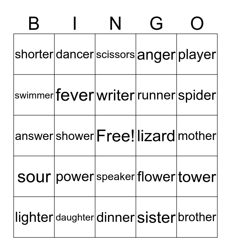 This bingo card has a free space and 31 words: dinner, mower, shower, teacher, shorter, scissors, fever, flower, lizard, sister, mother, brother, father, baker, spider, clover, tower, power, sour, speaker, player, faster, lighter, dancer, runner, swimmer, anger, answer, daughter, writer and helicopter.