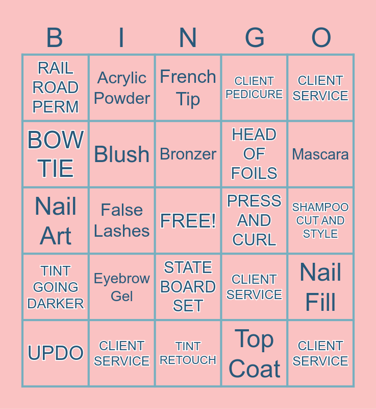 This bingo card has a free space and 54 words: CLIENT HAIR CUT, TINT GOING DARKER, HEAD OF FOILS, CLIENT HAIR CUT, STATE BOARD SET, PIGGY BACK PERM, CLIENT PEDICURE, BASIC PERM, BOW TIE, SPIRAL, RAIL ROAD PERM, MANICURE, CLIENT SERVICE, UPDO, CLIENT SERVICE, TINT RETOUCH, CLIENT SERVICE, HEAD OF FOILS, WAX, SHAMPOO CUT AND STYLE, CLIENT SERVICE, STATE BOARD SET, PRESS AND CURL, CLIENT SERVICE, Nail Polish, Acrylic Powder, Almond Shape, Gel Manicure, Pedicure, Top Coat, Cuticle, Round Nail, Stiletto Nail, Base Coat, French Tip, Nail Buffer, Nail Art, Nail Fill, Nail Brush, Blush, Lipstick, Concealer, Foundation, Setting Spray, Eyebrow Gel, Eyeliner, Eye Shadow, Contour, Bronzer, False Lashes, Mascara, Makeup Brushes, Highlighter and Lip Gloss.