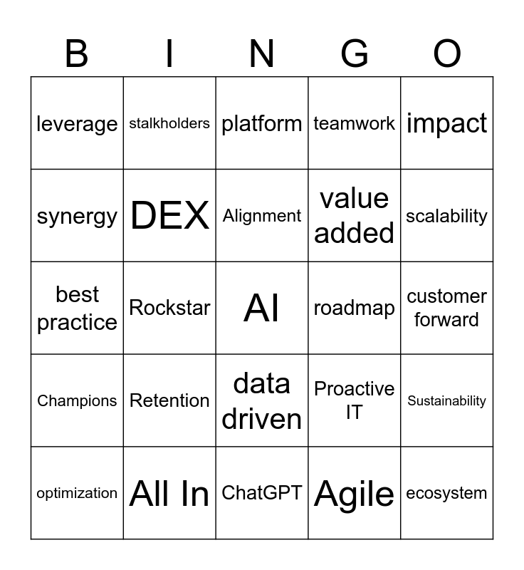This bingo card has a free space and 24 words: Retention, All In, Alignment, optimization, impact, leverage, synergy, stalkholders, roadmap, data driven, value added, best practice, Proactive IT, Sustainability, DEX, Agile, customer forward, platform, scalability, Rockstar, ecosystem, Champions, teamwork and ChatGPT.