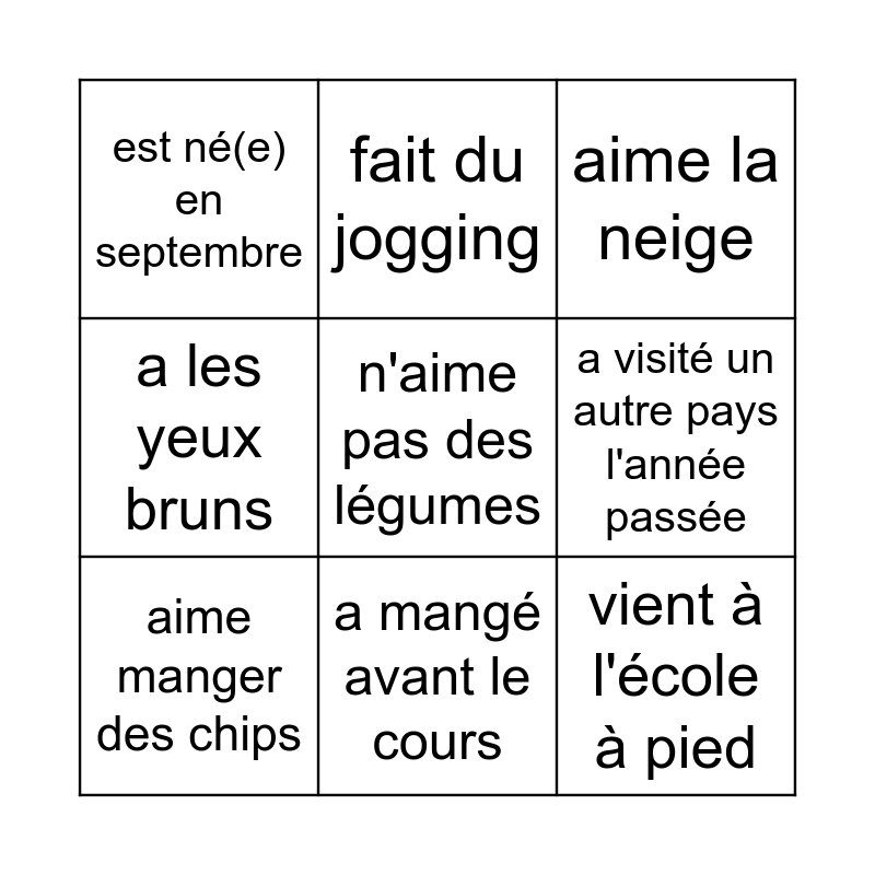 This bingo card has a free space and 8 words: a visité un autre pays l'année passée, aime la neige, fait du jogging, aime manger des chips, est né(e) en septembre, vient à l'école à pied, a les yeux bruns and a mangé avant le cours.