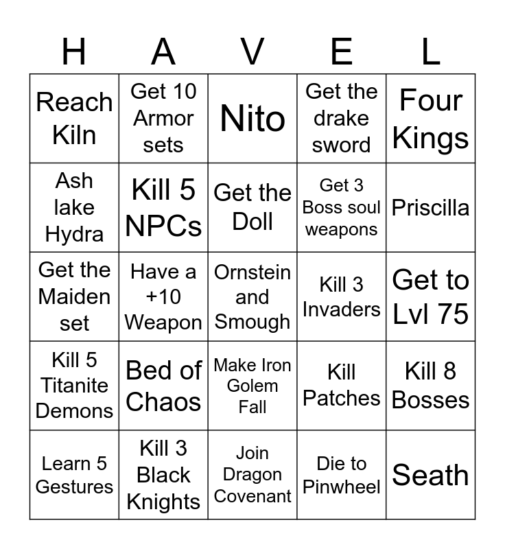 This bingo card has a free space and 24 words: Bed of Chaos, Kill 3 Black Knights, Get the Doll, Learn 5 Gestures, Four Kings, Reach Kiln, Ash lake Hydra, Get 10 Armor sets, Kill 3 Invaders, Make Iron Golem Fall, Get 3 Boss soul weapons, Get the Maiden set, Kill Patches, Kill 8 Bosses, Kill 5 NPCs, Die to Pinwheel, Get to Lvl 75, Nito, Priscilla, Have a +10 Weapon, Seath, Kill 5 Titanite Demons, Get the drake sword and Join Dragon Covenant.