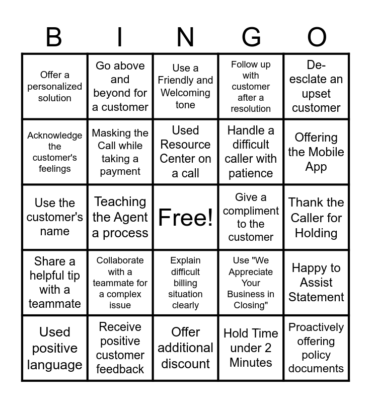 This bingo card has a free space and 24 words: Collaborate with a teammate for a complex issue, Receive positive customer feedback, Used Resource Center on a call, Used positive language, De-esclate an upset customer, Offer a personalized solution, Acknowledge the customer's feelings, Go above and beyond for a customer, Give a compliment to the customer, Explain difficult billing situation clearly, Handle a difficult caller with patience, Use the customer's name, Use "We Appreciate Your Business in Closing", Happy to Assist Statement, Masking the Call while taking a payment, Hold Time under 2 Minutes, Thank the Caller for Holding, Use a Friendly and Welcoming tone, Offering the Mobile App, Teaching the Agent a process, Proactively offering policy documents, Share a helpful tip with a teammate, Follow up with customer after a resolution and Offer additional discount.