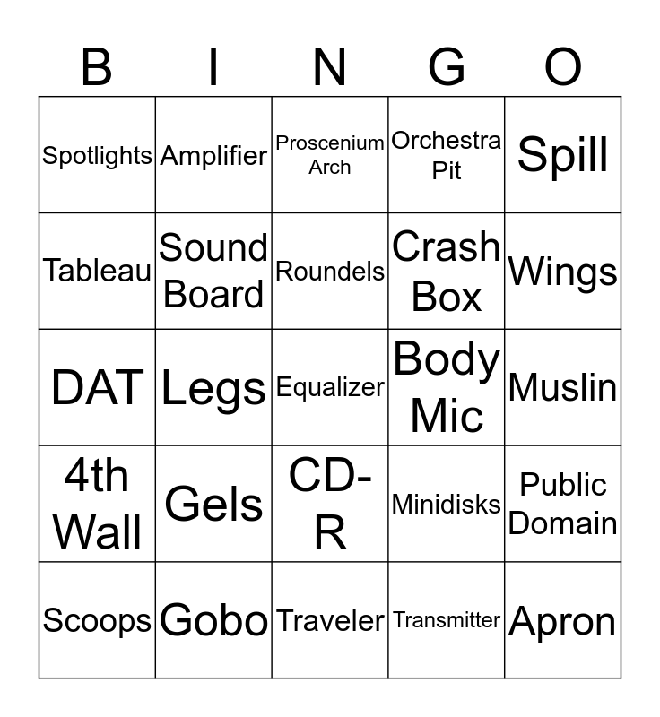 This bingo card has a free space and 24 words: Gels, Gobo, Roundels, Scoops, Spill, Spotlights, Tableau, Amplifier, Body Mic, CD-R, Crash Box, DAT, Minidisks, Public Domain, Sound Board, Transmitter, Muslin, Proscenium Arch, Wings, Legs, Apron, 4th Wall, Orchestra Pit and Traveler.