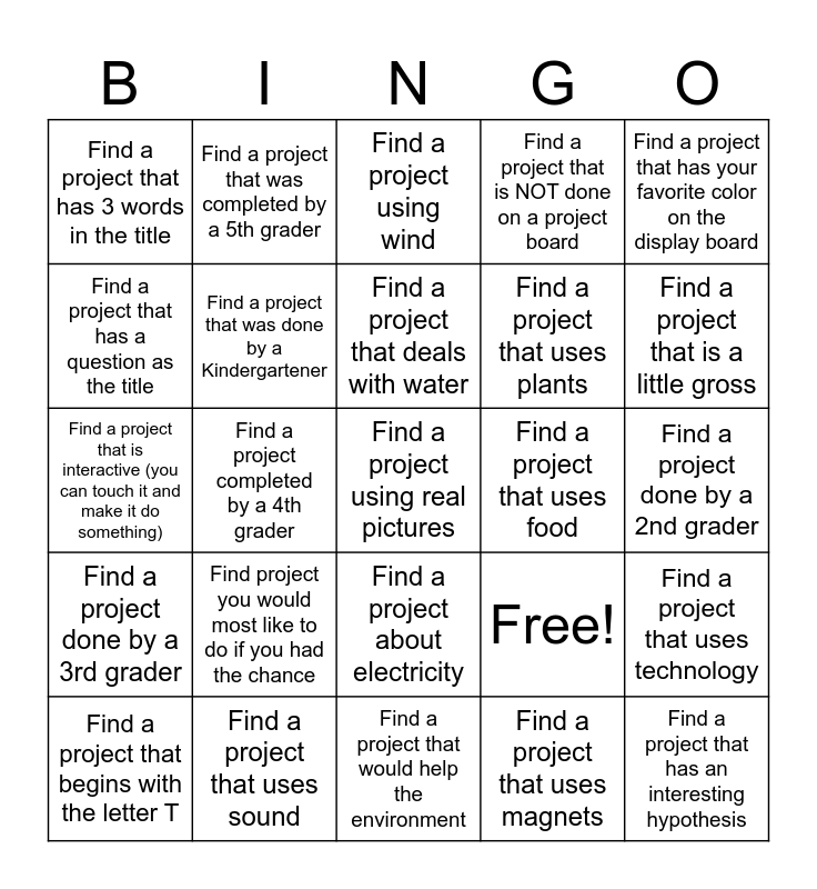 This bingo card has 25 words: Find project you would most like to do if you had the chance, Find a project that would help the environment, Find a project that deals with water, Find a project that begins with the letter T, Find a project that has your favorite color on the display board, Find a project that has 3 words in the title, Find a project that has a question as the title, Find a project that was completed by a 5th grader, Find a project that uses food, Find a project about electricity, Find a project that uses plants, Find a project that is interactive (you can touch it and make it do something), Free!, Find a project that uses technology, Find a project that was done by a Kindergartener, Find a project that has an interesting hypothesis, Find a project done by a 2nd grader, Find a project using wind, Find a project that is a little gross, Find a project completed by a 4th grader, Find a project using real pictures, Find a project that uses sound, Find a project done by a 3rd grader, Find a project that is NOT done on a project board and Find a project that uses magnets.