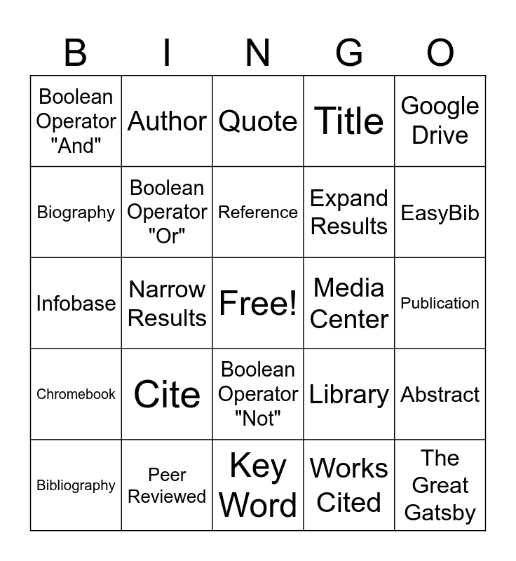 This bingo card has a free space and 38 words: Evidence, Advanced Search, Gale, Boolean Operator "Or", Abstract, Cite, Reference, Main Points, Google Drive, Expand Results, Narrow Results, Title, The Great Gatsby, Publication, Biography, Chromebook, Source, Quote, Boolean Operators, Media Center, Boolean Operator "And", Peer Reviewed, EasyBib, Bibliography, F Scott Fitzgerald, Key Word, Noodle Tools, MLA, The Great Depression, Facts on File, Support, Boolean Operator "Not", Works Cited, Author, EbscoHost, Library, Infobase and Full Text.