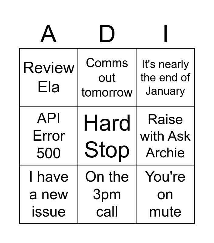 This bingo card has a free space and 8 words: Raise with Ask Archie, It's nearly the end of January, Comms out tomorrow, I have a new issue, Review Ela, You're on mute, API Error 500 and On the 3pm call.
