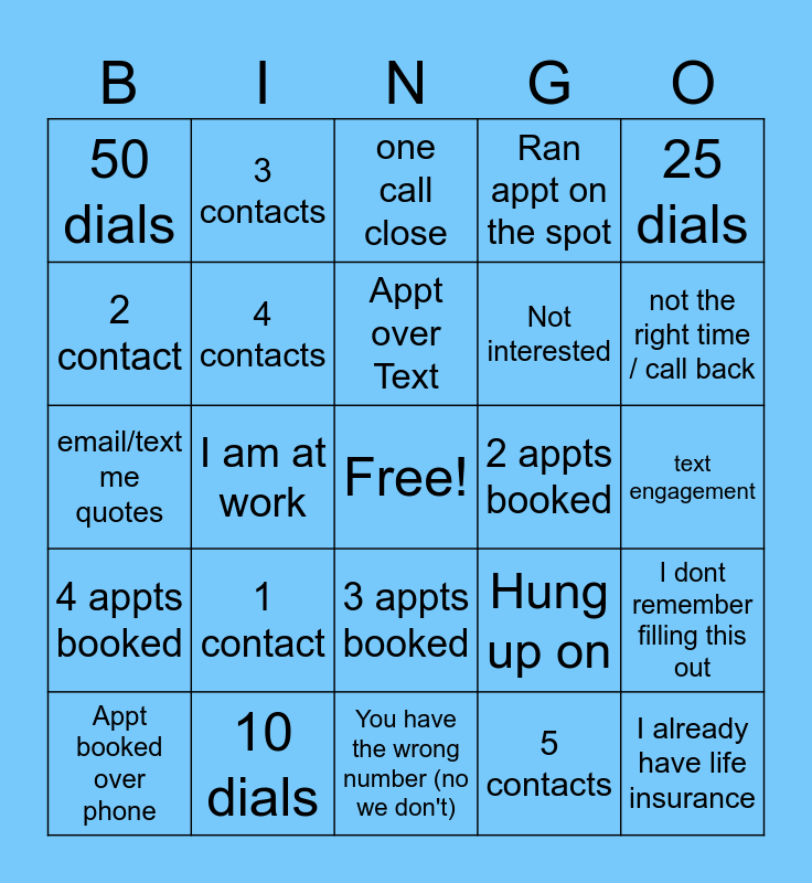 This bingo card has a free space and 24 words: 1 contact, 10 dials, Appt over Text, Appt booked over phone, 25 dials, 50 dials, 2 contact, 3 contacts, 2 appts booked, 3 appts booked, Not interested, email/text me quotes, Hung up on, I dont remember filling this out, 4 contacts, 5 contacts, text engagement, one call close, not the right time / call back, I am at work, I already have life insurance, 4 appts booked, Ran appt on the spot and You have the wrong number (no we don't).