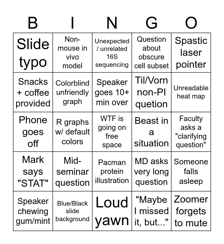 This bingo card has a free space and 24 words: Mid-seminar question, Blue/Black slide background, Speaker goes 10+ min over, Speaker chewing gum/mint, Spastic laser pointer, Slide typo, Snacks + coffee provided, Non-mouse in vivo model, Beast in a situation, Pacman protein illustration, Til/Vorn non-PI quetion, Phone goes off, MD asks very long question, Someone falls asleep, Colorblind unfriendly graph, "Maybe I missed it, but...", Faculty asks a "clarifying question", Unexpected / unrelated 16S sequencing, Unreadable heat map, R graphs w/ default colors, Zoomer forgets to mute, Mark says "STAT", Question about obscure cell subset and Loud yawn.