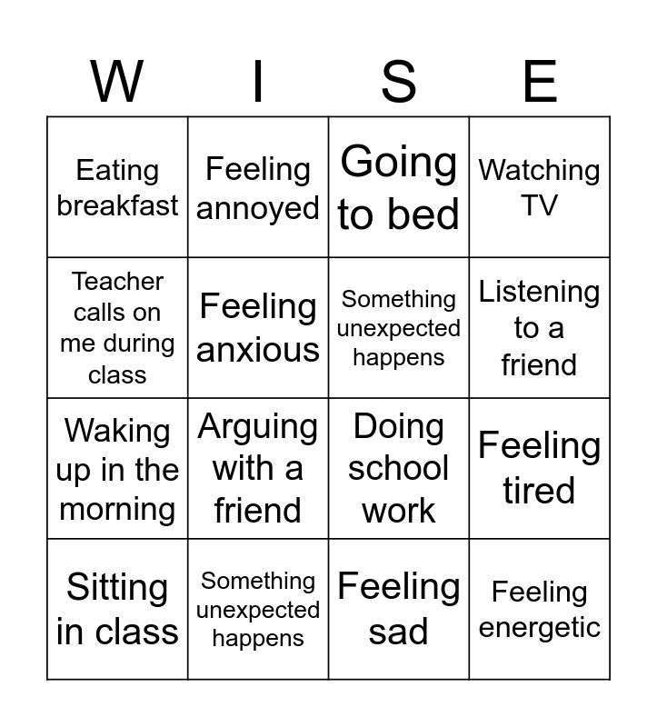 This bingo card has 18 words: Arguing with a friend, Feeling energetic, Going to bed, Eating breakfast, Doing school work, Watching TV, Sitting in class, Feeling annoyed, Listening to a friend, Waking up in the morning, Feeling sad, Teacher calls on me during class, Feeling tired, Feeling anxious, Something unexpected happens, Eating dinner, Something unexpected happens and Listening to a friend.