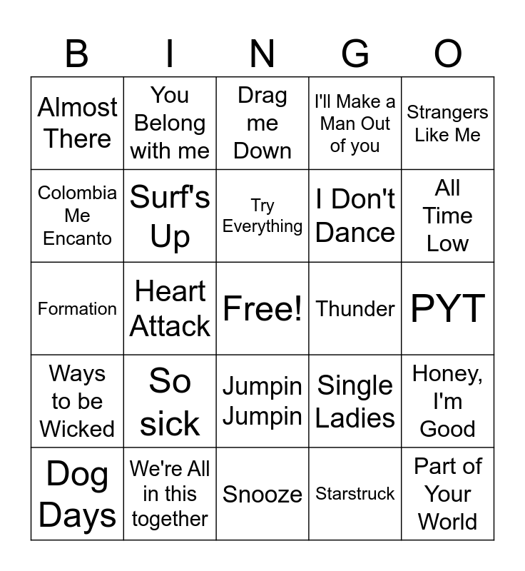 This bingo card has a free space and 60 words: Determinate, We're All in this together, Strut, Ways to be Wicked, Starstruck, I want it all, Surf's Up, More Than A Band, I Don't Dance, Busted, I'll Make a Man Out of you, Life is a highway, Colombia Me Encanto, We Know the Way, Can You Feel The Love Tonight, Almost There, Part of Your World, Strangers Like Me, I See The Light, Try Everything, Thunder, Drag me Down, Dog Days, Honey, I'm Good, One more night, Classic, Tonight Tonight, Positions, All Time Low, Don't let me down, 7 years, Lease on Life, Year 3000, Back to December, You Belong with me, Problem, Take a Hint, Heart Attack, E.T, Formation, Versace On The Floor, So sick, PYT, ABC, Single Ladies, Save Your Tears, Replay, Umbrella, Water, Jumpin Jumpin, Snooze, Smoking out the Window, Trip, Kiss, Attention, S&M by Rihanna, Miss Independent, Weak, Feeling Myself and Boo'd Up.