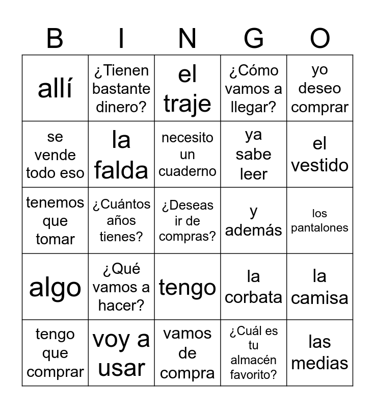 This bingo card has 25 words: ¿Qué vamos a hacer?, vamos de compra, necesito un cuaderno, tengo que comprar, yo deseo comprar, allí, se vende todo eso, ¿Tienen bastante dinero?, y además, tengo, ya sabe leer, tenemos que tomar, la corbata, la camisa, la falda, las medias, los pantalones, el traje, el vestido, ¿Cuántos años tienes?, ¿Deseas ir de compras?, voy a usar, algo, ¿Cómo vamos a llegar? and ¿Cuál es tu almacén favorito?.