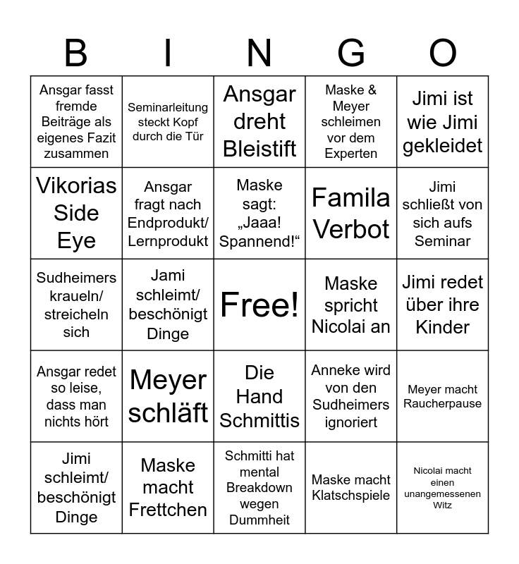 This bingo card has a free space and 24 words: Meyer schläft, Maske macht Frettchen, Maske sagt: „Jaaa! Spannend!“, Jimi schleimt/ beschönigt Dinge, Jimi ist wie Jimi gekleidet, Ansgar fasst fremde Beiträge als eigenes Fazit zusammen, Vikorias Side Eye, Seminarleitung steckt Kopf durch die Tür, Maske spricht Nicolai an, Die Hand Schmittis, Famila Verbot, Sudheimers kraueln/ streicheln sich, Anneke wird von den Sudheimers ignoriert, Meyer macht Raucherpause, Ansgar fragt nach Endprodukt/ Lernprodukt, Maske macht Klatschspiele, Jimi redet über ihre Kinder, Ansgar dreht Bleistift, Jimi schließt von sich aufs Seminar, Jami schleimt/ beschönigt Dinge, Nicolai macht einen unangemessenen Witz, Ansgar redet so leise, dass man nichts hört, Maske & Meyer schleimen vor dem Experten and Schmitti hat mental Breakdown wegen Dummheit.