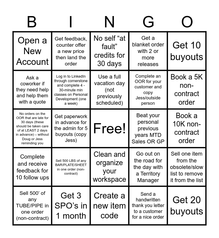 This bingo card has a free space and 24 words: Sell 500’ of any TUBE/PIPE in one order (non-contract), Sell 500 LBS of any BAR/PLATE/SHEET in one order (non-contract), Use a full vacation day (not previously scheduled), Send a handwritten thank you letter to a customer for a nice order, Get 10 buyouts, Open a New Account, Get feedback, counter offer a new price then land the order, No self “at fault” credits for 30 days, Beat your personal previous years MTD Sales OR GP, Book a 10K non-contract order, No orders on the OOR that are late for 30 days (these should be taken care of at LEAST 2 days in advance) – without Doug or Jess reminding you, Log in to LinkedIn through cornerstone and complete 4 - 30-minute min classes on Personal Development (one a week), Go out on the road for the day with a Territory Manager, Sell one item from the obsolete/slow list to remove it from the list, Ask a coworker if they need help and help them with a quote, Get 3 SPO’s in 1 month, Create a new item code, Get a blanket order with 2 or more releases, Book a 5K non-contract order, Complete and receive feedback for 10 follow ups, Get paperwork in advance for the admin for 5 buyouts (copy Jess), Clean and organize your workspace, Complete an OOR for your customer and copy Jess/outside person and Get 20 buyouts.