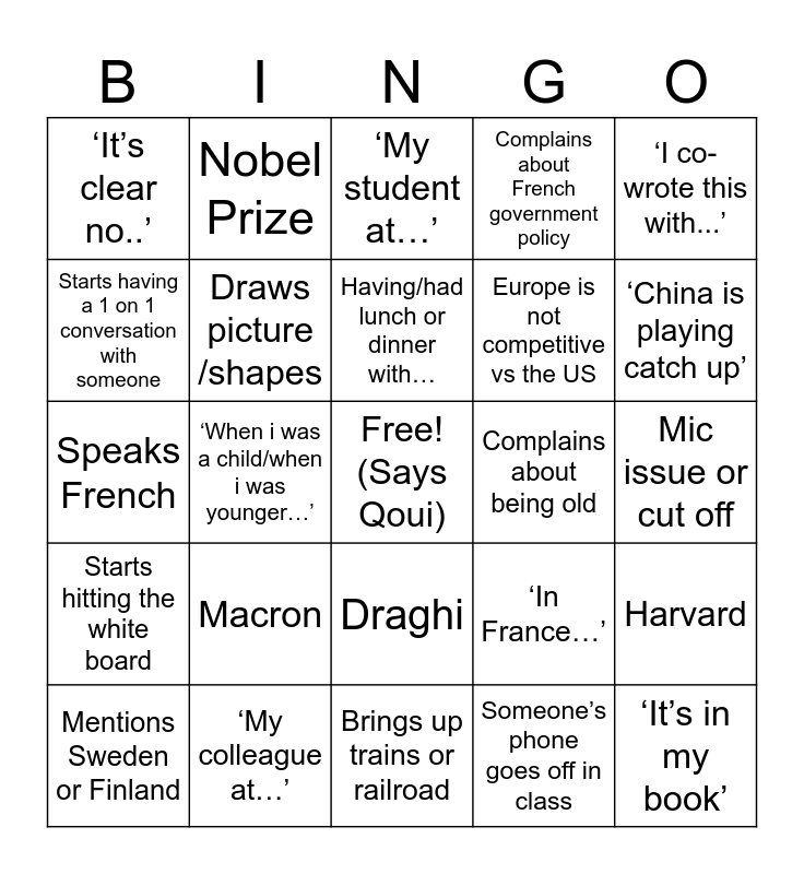 This bingo card has a free space and 24 words: Macron, ‘My colleague at…’, Having/had lunch or dinner with…, Mentions Sweden or Finland, ‘I co-wrote this with...’, ‘It’s clear no..’, Starts having a 1 on 1 conversation with someone, Nobel Prize, Complains about being old, Draghi, Europe is not competitive vs the US, Speaks French, ‘In France…’, Harvard, Draws picture /shapes, Someone’s phone goes off in class, Mic issue or cut off, ‘My student at…’, ‘China is playing catch up’, ‘When i was a child/when i was younger…’, ‘It’s in my book’, Starts hitting the white board, Complains about French government policy and Brings up trains or railroad.