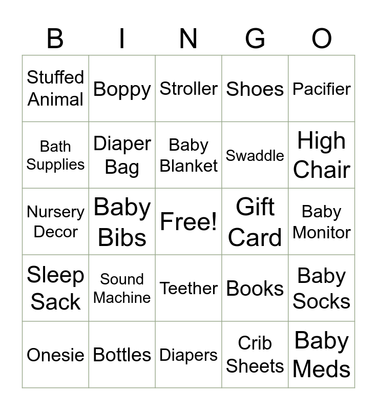 This bingo card has a free space and 24 words: Sound Machine, Bottles, Baby Blanket, Onesie, Pacifier, Stuffed Animal, Bath Supplies, Boppy, Gift Card, Teether, Swaddle, Nursery Decor, Books, Baby Socks, Diaper Bag, Crib Sheets, Baby Monitor, Stroller, High Chair, Baby Bibs, Baby Meds, Sleep Sack, Shoes and Diapers.