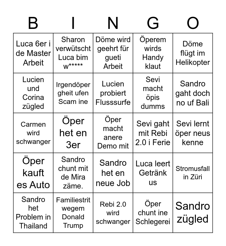 This bingo card has 25 words: Sandro chunt mit de Mira zäme., Rebi 2.0 wird schwanger, Lucien probiert Flusssurfe, Sandro het Problem in Thailand, Döme flügt im Helikopter, Luca 6er i de Master Arbeit, Lucien und Corina zügled, Sharon verwütscht Luca bim w*****, Sevi gaht mit Rebi 2.0 i Ferie, Sandro het en neue Job, Sevi macht öpis dumms, Carmen wird schwanger, Luca leert Getränk us, Stromusfall in Züri, Irgendöper gheit ufen Scam ine, Sandro zügled, Sevi lernt öper neus kenne, Döme wird geehrt für gueti Arbeit, Sandro gaht doch no uf Bali, Öper het en 3er, Öper macht anere Demo mit, Familiestrit wegem Donald Trump, Öper kauft es Auto, Öperem wirds Handy klaut and Öper chunt ine Schlegerei.