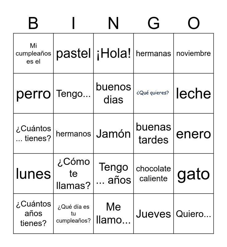 This bingo card has 1 images and 24 words: ¿Cómo te llamas?, Me llamo..., buenos dias, ¿Cuántos años tienes?, noviembre, Mi cumpleaños es el, perro, pastel, buenas tardes, Tengo ... años, ¿Cuántos ... tienes?, chocolate caliente, gato, Tengo..., Quiero..., enero, ¡Hola!, leche, hermanos, Jamón, ¿Qué día es tu cumpleaños?, lunes, hermanas and Jueves.