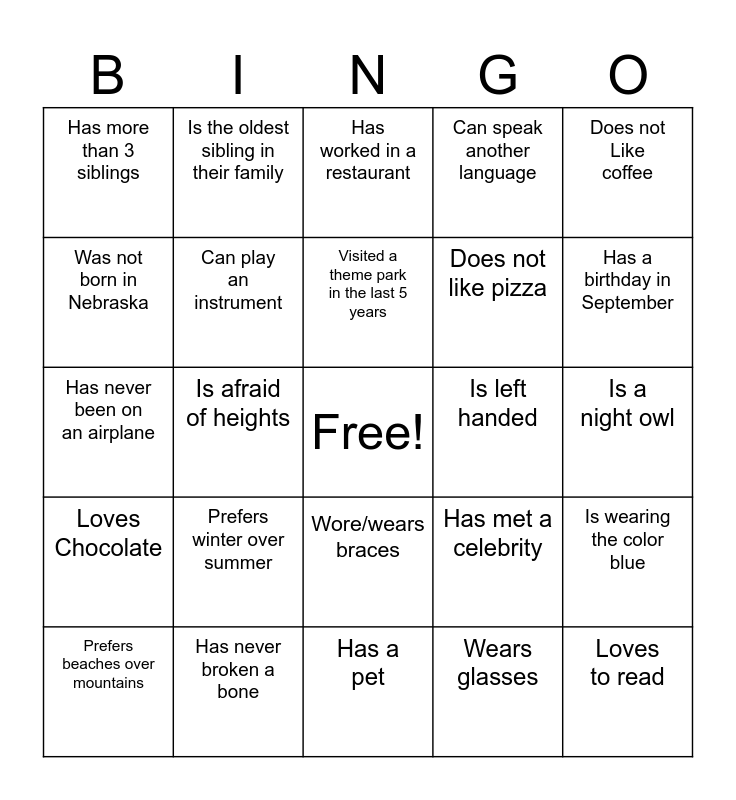 This bingo card has a free space and 24 words: Prefers winter over summer, Has never broken a bone, Visited a theme park in the last 5 years, Prefers beaches over mountains, Does not Like coffee, Has more than 3 siblings, Was not born in Nebraska, Is the oldest sibling in their family, Is left handed, Wore/wears braces, Does not like pizza, Has never been on an airplane, Has met a celebrity, Is wearing the color blue, Can play an instrument, Wears glasses, Is a night owl, Has worked in a restaurant, Has a birthday in September, Is afraid of heights, Loves to read, Loves Chocolate, Can speak another language and Has a pet.