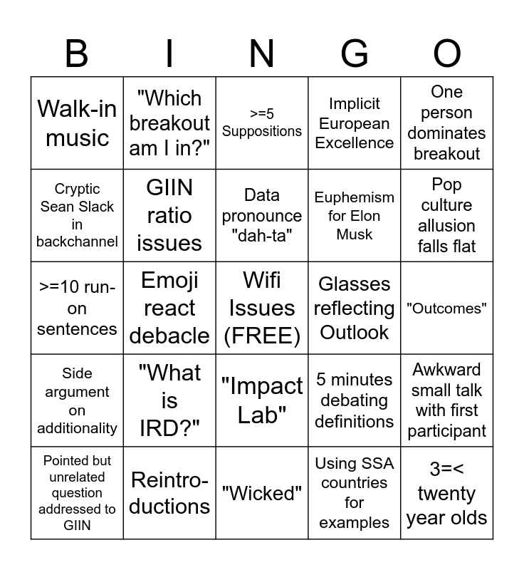 This bingo card has a free space and 24 words: "What is IRD?", Reintro- ductions, Data pronounce "dah-ta", Pointed but unrelated question addressed to GIIN, One person dominates breakout, Walk-in music, Cryptic Sean Slack in backchannel, "Which breakout am I in?", Glasses reflecting Outlook, "Impact Lab", Euphemism for Elon Musk, >=10 run-on sentences, 5 minutes debating definitions, Awkward small talk with first participant, GIIN ratio issues, Using SSA countries for examples, "Outcomes", >=5 Suppositions, Pop culture allusion falls flat, Emoji react debacle, 3=< twenty year olds, Side argument on additionality, Implicit European Excellence and "Wicked".