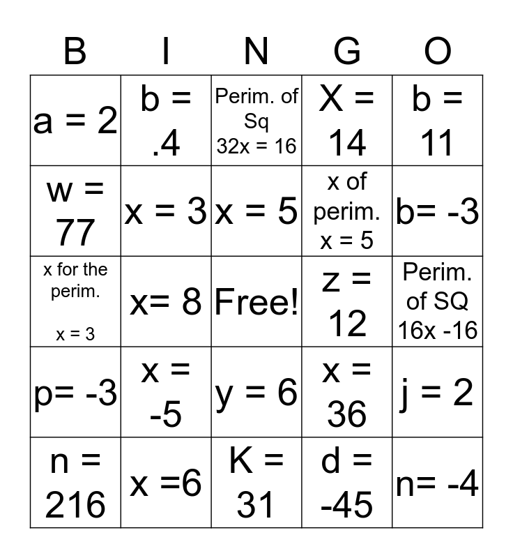 This bingo card has a free space and 24 words: x = -5, x =6, x = 5, n = 216, b = 11, a = 2, w = 77, b = .4, z = 12, y = 6, x of perim. x = 5, x for the perim. x = 3, x = 36, j = 2, x = 3, d = -45, Perim. of SQ 16x -16, Perim. of Sq 32x = 16, b= -3, x= 8, n= -4, p= -3, X = 14 and K = 31.