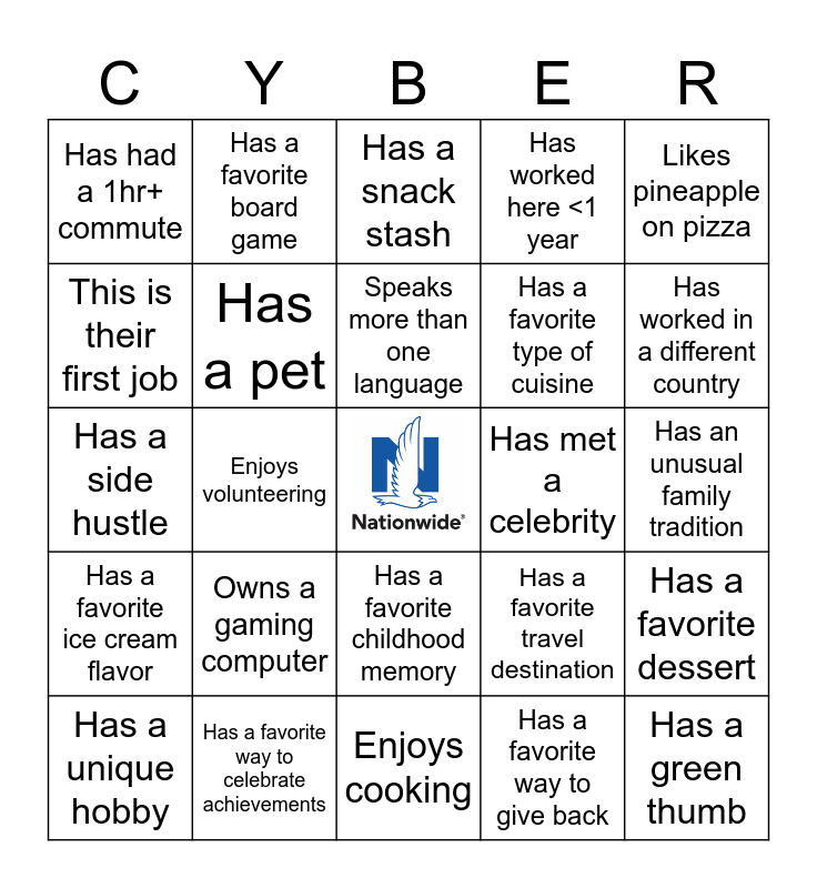 This bingo card has a free space and 78 words: Prefers remote work, Prefers working in office, Has a snack stash, Drinks 3+ cups coffee a day, Has worked here 3+ years, Has worked in another industry, Has a work playlist, Has a favorite pen, Has a messy desk, Has 0 unread emails, Prefers working in the morning, Prefers working at night, Has worked here <1 year, Has had a 1hr+ commute, Manager, This is their first job, Bikes to work, Owns a gaming computer, Knows how to surf, Has an unusual family tradition, Loves true crime podcasts, Likes pineapple on pizza, Has a side hustle, Speaks more than one language, Has a pet, Enjoys team-building activities, Has attended a virtual conference, Has a favorite coffee shop, Enjoys public speaking, Has a collection of something, Has worked in a different country, Has a favorite motivational quote, Enjoys cooking, Has run a marathon, Has a unique hobby, Has met a celebrity, Enjoys reading fiction, Has a favorite app, Has taken a sabbatical, Has a green thumb, Has a favorite charity, Enjoys DIY projects, Has a morning routine, Has a favorite TV show, Has traveled to more than 5 countries, Has a favorite board game, Enjoys meditation or yoga, Has a favorite sports team, Has a hidden talent, Has attended a workshop this year, Has a favorite dessert, Enjoys volunteering, Has a favorite travel destination, Has a unique skill, Has a favorite podcast, Has a work buddy, Has a favorite holiday, Enjoys networking events, Has a favorite quote about work, Has a favorite childhood memory, Has a favorite type of cuisine, Has a personal blog, Has a favorite workout routine, Has a favorite movie genre, Has a favorite way to unwind, Has a favorite social media platform, Has a favorite childhood book, Has a favorite outdoor activity, Has a favorite ice cream flavor, Has a favorite way to celebrate achievements, Has a favorite type of music, Has a favorite family recipe, Has a favorite way to stay organized, Has a favorite inspirational speaker, Has a favorite way to give back, Has a favorite type of tea, Has a favorite way to stay active and Has a favorite way to connect with colleagues.