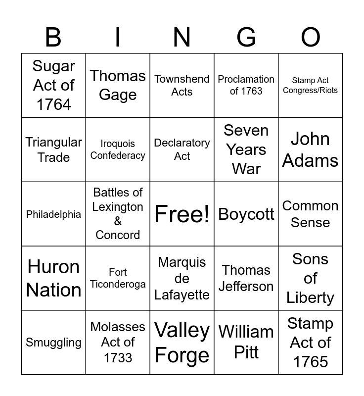 This bingo card has a free space and 60 words: Enlightenment, Molasses Act of 1733, Fort Necessity, Huron Nation, William Pitt, Ohio Country, Iroquois Confederacy, Battle of Quebec, Seven Years War, Treaty of Paris, 1763, Proclamation of 1763, Pontiac’s Rebellion, Triangular Trade, Board of Trade, Salutatory Neglect, Sugar Act of 1764, Stamp Act of 1765, Stamp Act Congress/Riots, Repeal, Declaratory Act, Boycott, Townshend Acts, Smuggling, Sons of Liberty, Committees of Correspondence, Boston Massacre, Paul Revere, Captain Thomas Preston, John Adams, Tea Act of 1773, Boston Tea Party, Coercive/Intolerable Acts, Patriots, Minutemen, Thomas Gage, Loyalists, King George III, Battles of Lexington & Concord, George Washington, Philadelphia, Battle of Breeds/Bunker Hill, Fort Ticonderoga, Common Sense, Hessians, Thomas Jefferson, John Hancock, Benjamin Franklin, General & Admiral Howe, Battle of Trenton, Marquis de Lafayette, Valley Forge, Battle of Saratoga, John Burgoyne, France & Spain, Francis Marion, Benedict Arnold, Comte de Rochambeau, Lord Charles Cornwallis, Battle of Yorktown and Treaty of Paris, 1783.