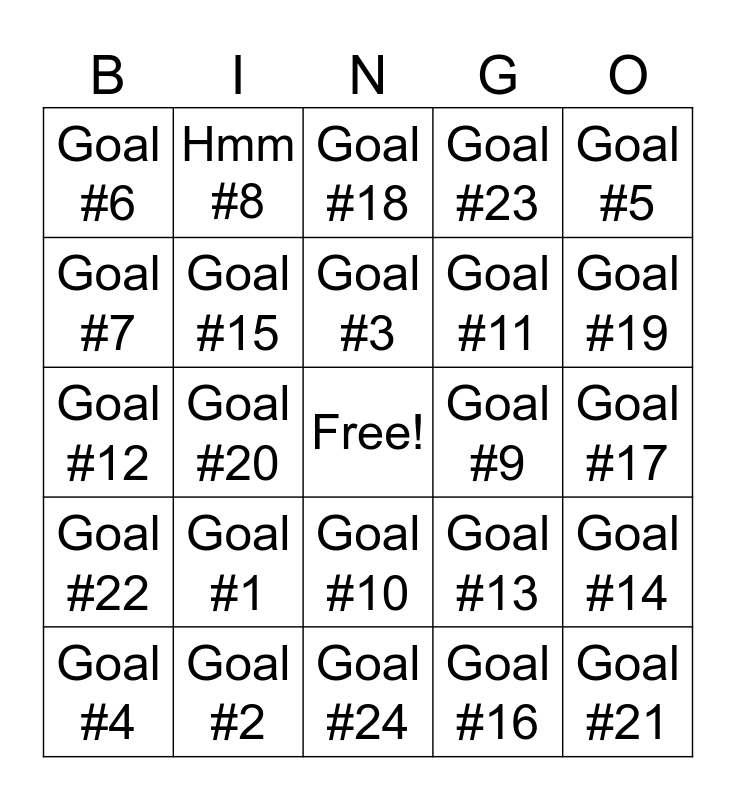 This bingo card has a free space and 24 words: Goal #1, Goal #2, Goal #3, Goal #4, Goal #5, Goal #6, Goal #7, Hmm #8, Goal #9, Goal #10, Goal #11, Goal #12, Goal #13, Goal #14, Goal #15, Goal #16, Goal #17, Goal #18, Goal #19, Goal #20, Goal #21, Goal #22, Goal #23 and Goal #24.