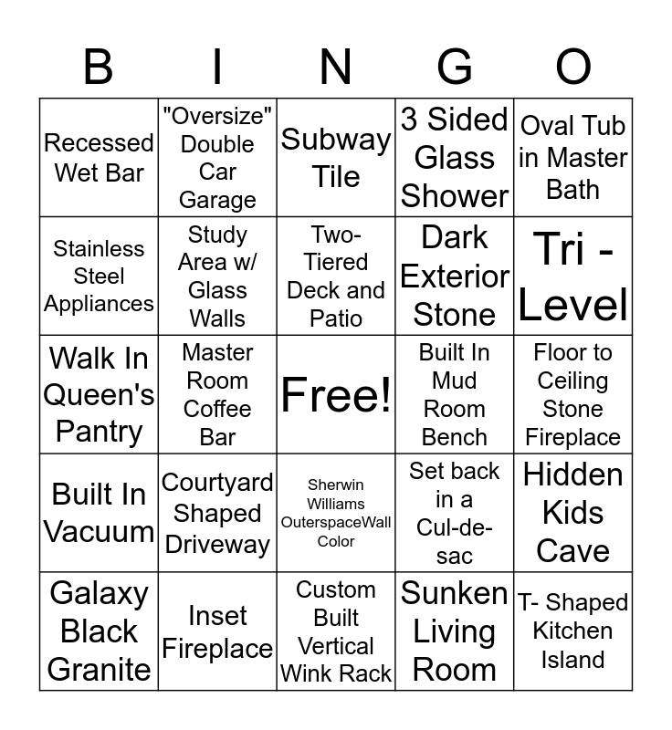 This bingo card has a free space and 24 words: Courtyard Shaped Driveway, Inset Fireplace, Two-Tiered Deck and Patio, Galaxy Black Granite, Oval Tub in Master Bath, Recessed Wet Bar, Stainless Steel Appliances, "Oversize" Double Car Garage, Built In Mud Room Bench, Sherwin Williams OuterspaceWall Color, Dark Exterior Stone, Walk In Queen's Pantry, Set back in a Cul-de-sac, Hidden Kids Cave, Study Area w/ Glass Walls, Sunken Living Room, Floor to Ceiling Stone Fireplace, Subway Tile, Tri - Level, Master Room Coffee Bar, T- Shaped Kitchen Island, Built In Vacuum, 3 Sided Glass Shower and Custom Built Vertical Wink Rack.