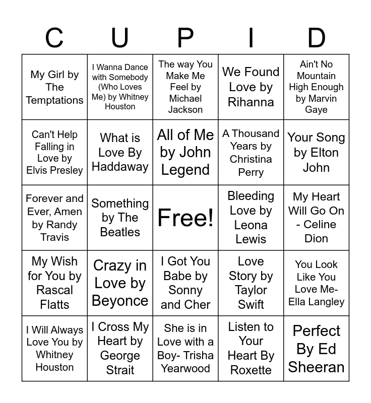 This bingo card has a free space and 24 words: Crazy in Love by Beyonce, I Cross My Heart by George Strait, All of Me by John Legend, I Will Always Love You by Whitney Houston, Ain't No Mountain High Enough by Marvin Gaye, My Girl by The Temptations, Can't Help Falling in Love by Elvis Presley, I Wanna Dance with Somebody (Who Loves Me) by Whitney Houston, Bleeding Love by Leona Lewis, I Got You Babe by Sonny and Cher, A Thousand Years by Christina Perry, Forever and Ever, Amen by Randy Travis, Love Story by Taylor Swift, You Look Like You Love Me- Ella Langley, What is Love By Haddaway, Listen to Your Heart By Roxette, My Heart Will Go On - Celine Dion, The way You Make Me Feel by Michael Jackson, Your Song by Elton John, Something by The Beatles, Perfect By Ed Sheeran, My Wish for You by Rascal Flatts, We Found Love by Rihanna and She is in Love with a Boy- Trisha Yearwood.