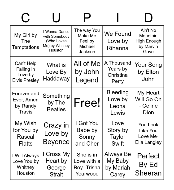 This bingo card has a free space and 24 words: Crazy in Love by Beyonce, I Cross My Heart by George Strait, All of Me by John Legend, I Will Always Love You by Whitney Houston, Ain't No Mountain High Enough by Marvin Gaye, My Girl by The Temptations, Can't Help Falling in Love by Elvis Presley, I Wanna Dance with Somebody (Who Loves Me) by Whitney Houston, Bleeding Love by Leona Lewis, I Got You Babe by Sonny and Cher, A Thousand Years by Christina Perry, Forever and Ever, Amen by Randy Travis, Love Story by Taylor Swift, You Look Like You Love Me- Ella Langley, What is Love By Haddaway, Always Be My Baby by Mariah Carey, My Heart Will Go On - Celine Dion, The way You Make Me Feel by Michael Jackson, Your Song by Elton John, Something by The Beatles, Perfect By Ed Sheeran, My Wish for You by Rascal Flatts, We Found Love by Rihanna and She is in Love with a Boy- Trisha Yearwood.