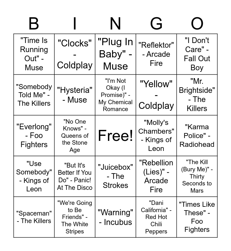 This bingo card has a free space and 43 words: "Crawling" - Linkin Park, "Times Like These" - Foo Fighters, "I Don't Love You" - My Chemical Romance, "Spaceman" - The Killers, "Paradise" - Coldplay, "Dani California" - Red Hot Chili Peppers, "Plug In Baby" - Muse, "Brick by Boring Brick" - Paramore, "I Don't Care" - Fall Out Boy, "We're Going to Be Friends" - The White Stripes, "Reflektor" - Arcade Fire, "Molly's Chambers" - Kings of Leon, "Juicebox" - The Strokes, "But It's Better If You Do" - Panic! At The Disco, "Edge of the Earth" - Thirty Seconds to Mars, "Warning" - Incubus, "In the End" - Linkin Park, "Everlong" - Foo Fighters, "Helena" - My Chemical Romance, "Mr. Brightside" - The Killers, "Clocks" - Coldplay, "Californication" - Red Hot Chili Peppers, "All the Small Things" - Blink-182, "Time Is Running Out" - Muse, "Misery Business" - Paramore, "Karma Police" - Radiohead, "Sugar, We're Goin Down" - Fall Out Boy, "Seven Nation Army" - The White Stripes, "Rebellion (Lies)" - Arcade Fire, "Use Somebody" - Kings of Leon, "Last Nite" - The Strokes, "The Kill (Bury Me)" - Thirty Seconds to Mars, "Drive" - Incubus, "No One Knows" - Queens of the Stone Age, "Breaking the Habit" - Linkin Park, "Boulevard of Broken Dreams" - Green Day, "The Pretender" - Foo Fighters, "I'm Not Okay (I Promise)" - My Chemical Romance, "Somebody Told Me" - The Killers, "Yellow" - Coldplay, "Scar Tissue" - Red Hot Chili Peppers, "Hysteria" - Muse and "That's What You Get" - Paramore.