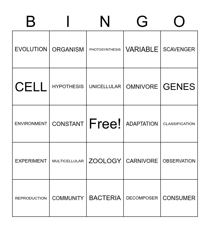 This bingo card has a free space and 39 words: DNA, THEORY, THEORY, CARNIVORE, OBSERVATION, EXPERIMENT, CONSTANT, ECOLOGY, ADAPTATION, CLASSIFICATION, CELL, ORGANISM, NUCLEUS, GENES, ENVIRONMENT, MULTICELLULAR, ZOOLOGY, VARIABLE, BOTANY, REPRODUCTION, HYPOTHESIS, UNICELLULAR, DECOMPOSER, SCAVENGER, RESPIRATION, COMMUNITY, BACTERIA, WATER, PREDATOR, EVOLUTION, HERBIVORE, MUTATION, OMNIVORE, CONSUMER, POPULATION, VIRUS, PHOTOSYNTHESIS, PRODUCER and FOOD CHAIN.