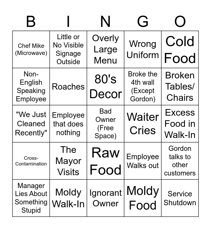 This bingo card has a free space and 34 words: Handful of Slime or Sludge, Moldy Food, Menu Items Not Available, "That's just his opinion", Cross-Contamination, Roaches, Cold Food, Manager Lies About Something Stupid, Little or No Visible Signage Outside, Burned Food, 80's Decor, Overly Large Menu, Broken Appliance, Rat Droppings, Waiter Cries, Broken Tables/ Chairs, Moldy Walk-In, "We Just Cleaned Recently", The Mayor Visits, Employee Walks out, Raw Food, Crying Family Members, Chef Mike (Microwave), Excess Food in Walk-In, Ignorant Owner, Service Shutdown, Wrong Uniform, Closed at the end of episode, Broke the 4th wall (Except Gordon), Non-English Speaking Employee, Owner Confronts Customer, Employee that does nothing, Gordon talks to other customers and Employee Fired mid-Episode.