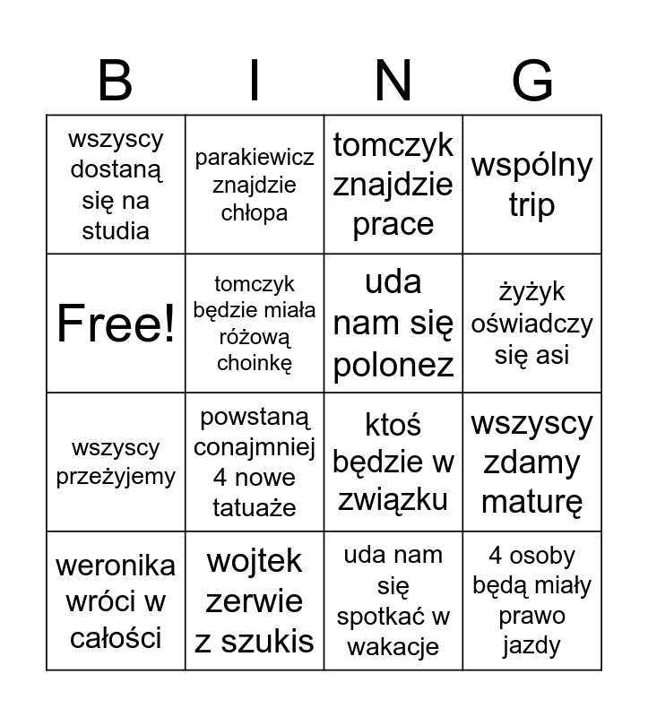 This bingo card has 16 words: wojtek zerwie z szukis, wszyscy zdamy maturę, tomczyk znajdzie prace, wszyscy dostaną się na studia, wszyscy przeżyjemy, parakiewicz znajdzie chłopa, ktoś będzie w związku, uda nam się spotkać w wakacje, Free!, tomczyk będzie miała różową choinkę, weronika wróci w całości, wspólny trip, powstaną conajmniej 4 nowe tatuaże, żyżyk oświadczy się asi, uda nam się polonez and 4 osoby będą miały prawo jazdy.