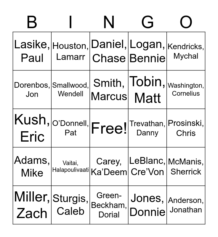 This bingo card has a free space and 24 words: Vaitai, Halapoulivaati, Sturgis, Caleb, Smith, Marcus, Miller, Zach, Kendricks, Mychal, Lasike, Paul, Dorenbos, Jon, Houston, Lamarr, Trevathan, Danny, Carey, Ka’Deem, Tobin, Matt, Kush, Eric, LeBlanc, Cre’Von, McManis, Sherrick, Smallwood, Wendell, Jones, Donnie, Prosinski, Chris, Daniel, Chase, Washington, Cornelius, O’Donnell, Pat, Anderson, Jonathan, Adams, Mike, Logan, Bennie and Green-Beckham, Dorial.