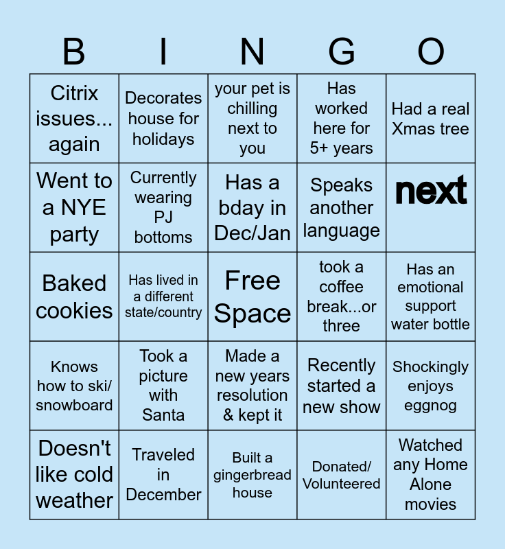 This bingo card has a free space and 24 words: Took a picture with Santa, Traveled in December, Has a bday in Dec/Jan, Doesn't like cold weather, Had a real Xmas tree, Citrix issues... again, Went to a NYE party, Decorates house for holidays, took a coffee break...or three, Made a new years resolution & kept it, Speaks another language, Baked cookies, Recently started a new show, Shockingly enjoys eggnog, Currently wearing PJ bottoms, Donated/ Volunteered, Has an emotional support water bottle, your pet is chilling next to you, next, Has lived in a different state/country, Watched any Home Alone movies, Knows how to ski/ snowboard, Has worked here for 5+ years and Built a gingerbread house.