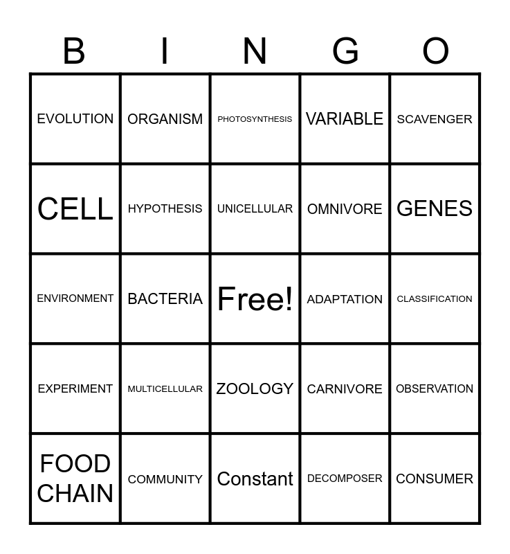 This bingo card has a free space and 39 words: DNA, THEORY, Energy, CARNIVORE, OBSERVATION, EXPERIMENT, BACTERIA, ECOLOGY, ADAPTATION, CLASSIFICATION, CELL, ORGANISM, NUCLEUS, GENES, ENVIRONMENT, MULTICELLULAR, ZOOLOGY, VARIABLE, VIRUS, FOOD CHAIN, HYPOTHESIS, UNICELLULAR, DECOMPOSER, SCAVENGER, RESPIRATION, COMMUNITY, Constant, WATER, PREDATOR, EVOLUTION, HERBIVORE, MUTATION, OMNIVORE, CONSUMER, POPULATION, Protein, PHOTOSYNTHESIS, PRODUCER and Reproduction.